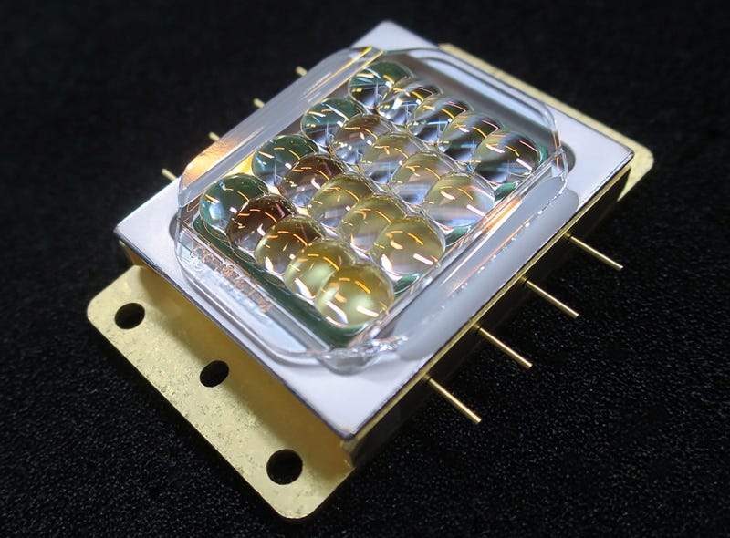 Es importante aclarar que estos diodos no son simples bombillas sueltas. Tanto en los proyectores de fósforo como en los RGB, la luz proviene de módulos metálicos compactos (bancos de diodos) que agrupan decenas de emisores láser. Cada emisor cuenta con su propia micro-lente para generar un chorro de luz paralelo y extremadamente potente. Todos esos haces se combinan y pasan luego por una lente de enfoque principal que los concentra y los dirige con total precisión hacia el siguiente componente del sistema.