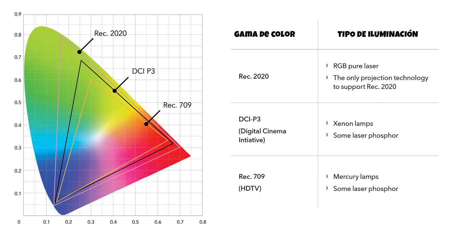 El principal “problema” es que el color rojo que se obtiene suele ser más débil o anaranjado, ya que proviene de una transformación química y no de una fuente pura. Eso hace que el color de la proyección no sea perfecto y sólo se consiga una gama de color de DCI-P3, que aunque es el estandar que se exige en las salas de cine profesional, sólo representa un 35% de todos los colores que puede ver el ojo humano. Eso sí, los proyectores de fósforo suelen durar más horas antes de empezar a perder brillo.