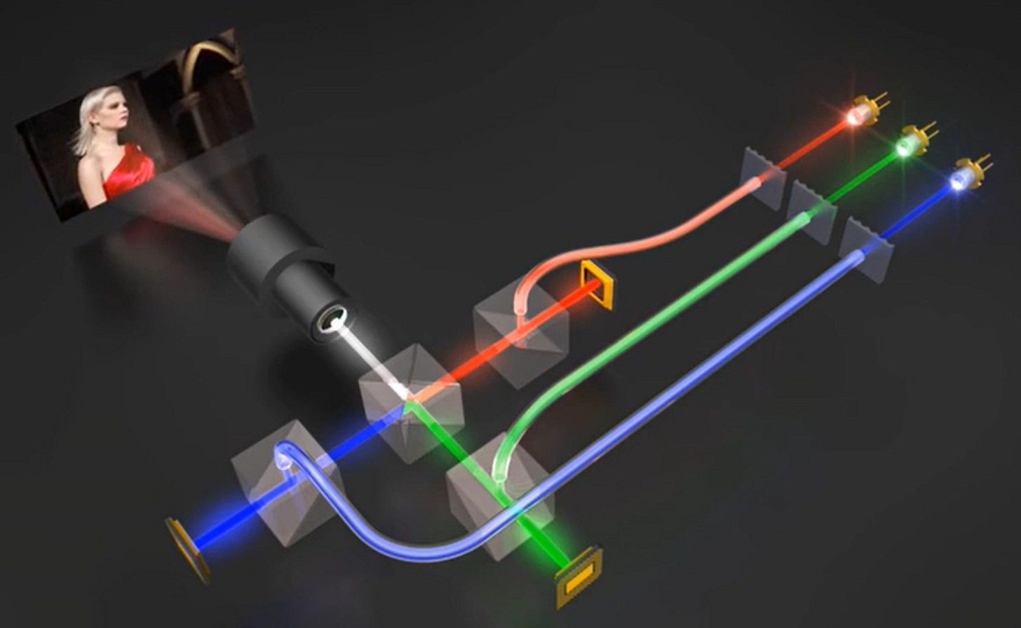 En cambio el láser RGB, conocido como Real | Laser, cuenta con tres fuentes de luz independientes: diodos láser rojos, verdes y azules dedicados. No hay ruedas de fósforo ni transformaciones químicas de por medio; cada color primario se genera de forma nativa y pura y se dirige a su propio chip DLP a través de un prisma de alta precisión.