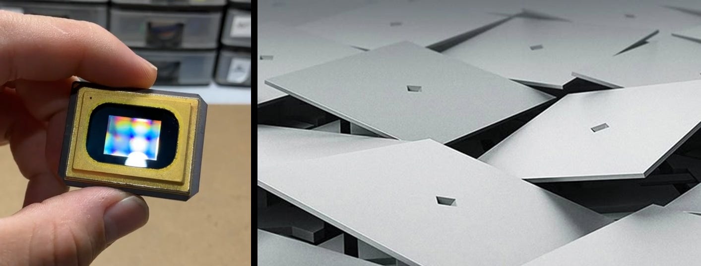 El chip DMD (Digital Micromirror Device) es una pieza de silicio cubierta por millones de espejos microscópicos, donde cada uno representa un píxel de la imagen. Estos espejos se mueven miles de veces por segundo, inclinándose para reflejar la luz hacia la lente si el píxel debe estar encendido, o hacia una ‘trampa de luz’ si debe estar apagado. Si en Regreso al Futuro el Condensador de Fluzo era lo que hacía posible viajar en el tiempo, el chip DMD es el componente que hace posible ‘dibujar’ la imagen que vemos en la pantalla.