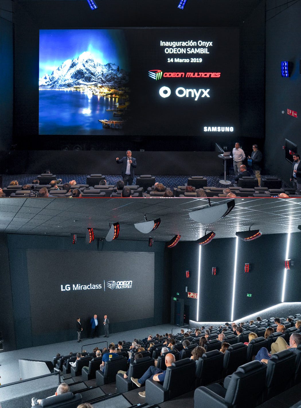El ejemplo más reciente de su audacia es la instalación en diciembre de 2025 de la primera pantalla LED transparente de Europa en el Odeon Sambil (Madrid). Se trata de una estructura scope de la marca Tricorne con 216 paneles modulares, 18 metros de largo y una resolución de 5.184 × 2.160 píxeles. Su gran innovación técnica es que, al ser transparente, permite colocar los altavoces directamente detrás sin sacrificar la calidad acústica, permitiendo que el sonido Dolby Atmos fluya de forma cristalina a través de la imagen, algo imposible en pantallas LED convencionales.